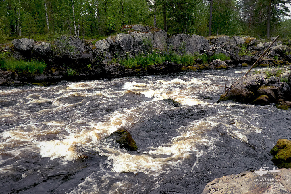 Обычно туристы действительно заканчивают сплав по Водле именно в этом месте. В туристических дневниках написано: “Далее река спортивного интереса не представляет”. Но я позволю себе не согласиться с этим утверждением. Пороги еще будут, пусть не такие частые и мощные, но это ещё не всё, и следующие три из них находятся прямо на выходе из деревни.